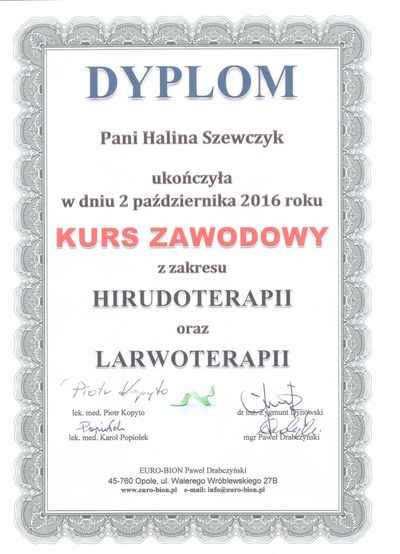 Zapraszam na bezpłatną konsultację po wcześniej umówionej wizycie. Dyplomowany hirudoterapeuta, larwoterapeuta - Halina Szewczyk.